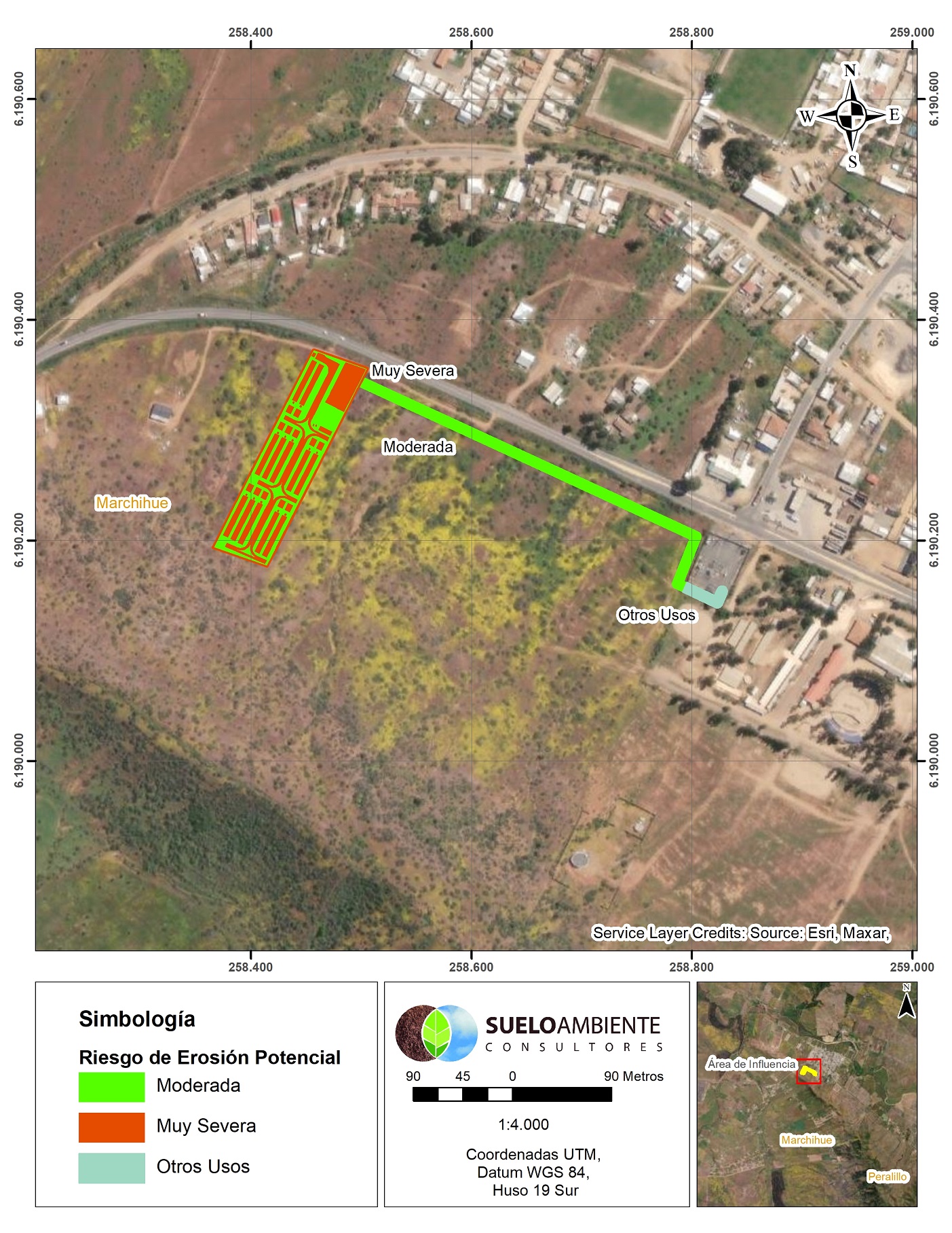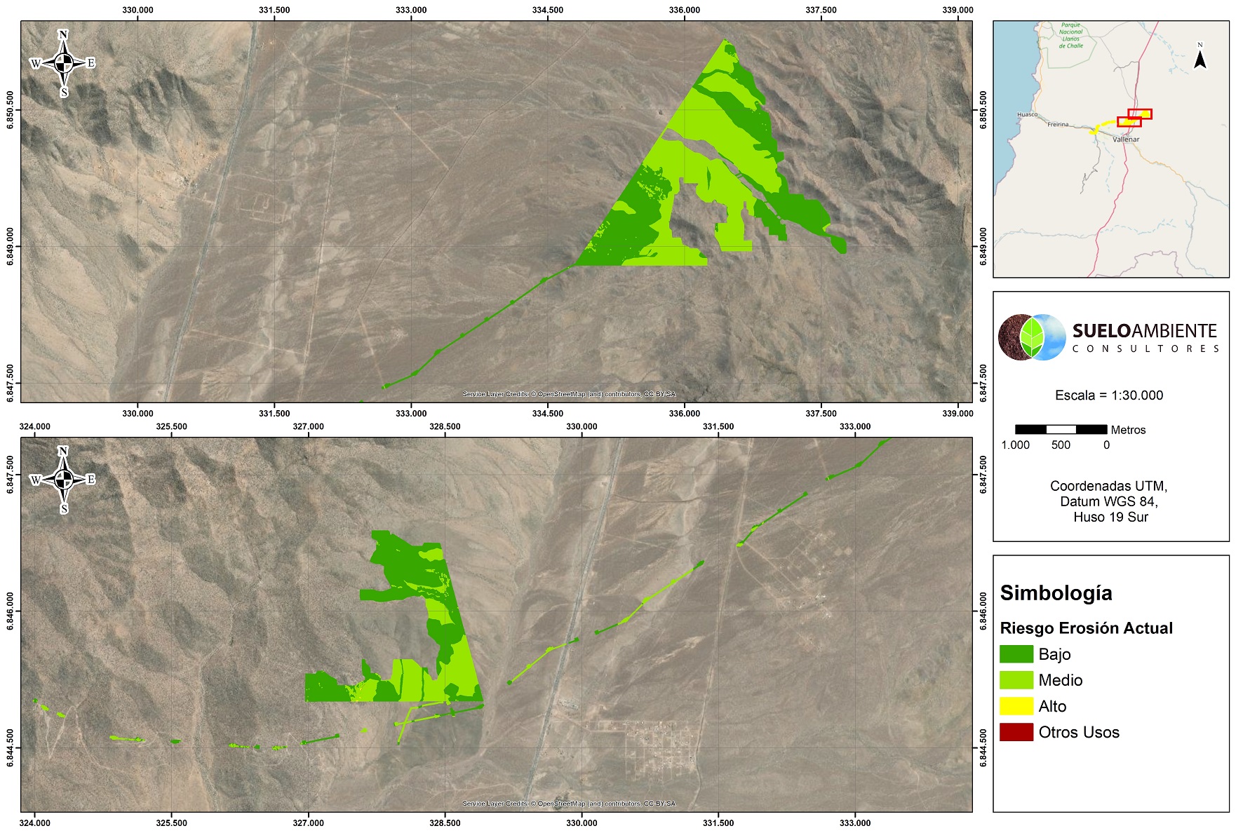 Informe que detalla los niveles de riesgo de erosión en el área de influencia del componente suelo, bajo la condición “sin proyecto” (riesgo de erosión actual, REA), y bajo la condición “con proyecto” (riesgo de erosión potencial, REP). La determinación de riesgo de erosión se basa en el documento “Evaluación de Impactos de Riesgos de Activación de Procesos Erosivos” validada por la División de Protección de los Recursos Naturales Renovables del Servicio Agrícola y Ganadero (SAG, 2016). La determinación del riesgo de erosión es parte de las exigencias contenidas en la Guía Metodológica para la Descripción de Ecosistemas Terrestres (SEA, 2024a), y aplica especialmente cuando se trata de proyectos lineales y proyectos areales en los cuales el relieve se asocia a pendientes predominantes por sobre 15% de pendiente.